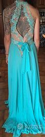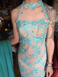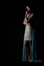Favoloso vestito da cerimonia, di Bagatelle! Taglia 44. Color cipria e verde Tiffany! Molto particolare, formato da tubino ( lunghezza sopra ginocchio) schiena scoperta . Questa è la prima versione. La seconda propone lo strascico che viene legato in vita con fiocco dietro, un leggero tulle dietro che da un il giusto volume al vestito. Il pizzo verde è stupendo, ed è tutto curato nei particolari. Con L abbronzatura si fa un figurone!!!