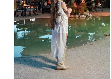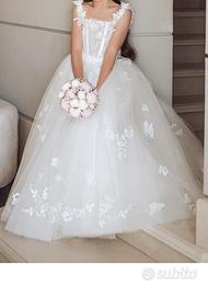 Vestito sartoriale con applicazione di farfalle all’interno della stoffa gonnellone estrsibile e sotto esce una tutina con aplicaxione di fiocco sul sedere mia figlia veste 11 anni pagato 1,800 euro