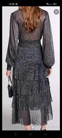 Maje abito lungo con tessuto scintillante. Scollo a V e maniche lunghe, nero con effetto argento.