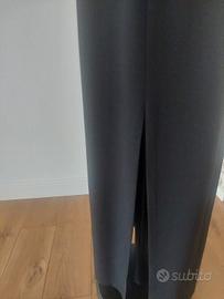 Vestito da sera nero taglia 42/44 lungo senza maniche con scollo rotondo davanti e ampia scollatura sulla schiena. Profondo spacco davanti. Chiusura con cerniera dietro. Abito di taglio elegante ma alla stesso tempo sexy e sensuale grazie allo spacco davanti e alla scollatura sulla schiena. Perfetto a tutte le età.