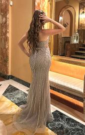 Vestito da cerimonia elegante, come nuovo, usato solo in occasione del diciottesimo. Colore argento ricoperto di strass e brillantini, strati di tulle e sottoveste. Taglia XS ma veste comodo perchè dispone di chiusura a corsetto sul retro, davanti invece vi è uno scollo a punta smanicato.