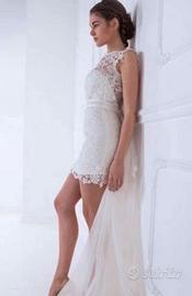Abito da sposa a sirena di sartoria, mai indossato, tg. 38-40, con corpino bianco in pizzo macrame e mikado di seta, gonna organza di seta e tulle. Bottoni e fascia in vita aggiunta di colore rosso. La coda si può staccare e diventare a tubino. Nelle foto le misure del vestito. Disponibile per prova.