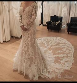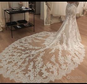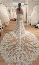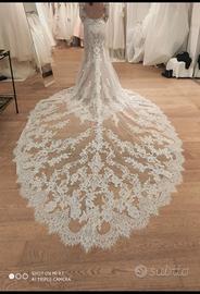 Abito da sposa a sirena in pizzo marca Demetrios, con coda ampia e molto scenografica. Su misura, ma con riprese per eventuali modifiche. Come nuovo, senza difetti o graffi.