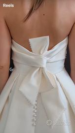 Abito in stile principessa, stile classico realizzato interamente in Mikado con dettagli in cristallo su una scollatura profonda e rifinito con un fiocco sulla schiena. MAI utilizzato, ancora presente in atelier.