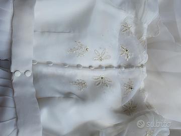 Vendo vestito da sposa, tg 42, tutto perlinato a mano, con coroncina perlinata sempre a mano, è stato lavato, ha la sua scatola, come nuovo, stile anni 80.