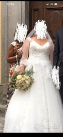 Meraviglioso vestito da sposa, usato 3 ore, lavato e igienizzato in lavanderia, nessun difetto, compreso di velo con rifinitura di pizzo e strascico, corpetto con brillanti e perline,dietro ha una scollatura molto elegante rifinita con bottoncini rivestiti, marca Nicole linea Jolies, pagato in atelier €3200,00 tenuto nella sua custodia, la taglia segna una 52 ma può essere aggiustato a misura. AFFARE.
