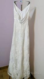 Abito da sposa taglia 40, di raso rivestito di pizzo, color bianco ottico, completato da bolero e guanti corti in raso ed anche cuscino per fedi dello stesso tessuto del vestito. Sulla schiena fila di bottoni a mascherare una cerniera.