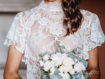 Vestito da sposa composto da gonna plissettata lunga in chiffon + corpetto in pizzo interamente lavorato a mano con cerniera sul retro, stile bohemien/boho chic.