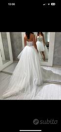 Taglio corto davanti e lungo dietro, un abito dalla vestibilità leggera e comoda, personalmente molto femminile. Il corpetto rimane è composto da 2 tipi diversi di pizzo e la gonna è a balze in tulle.