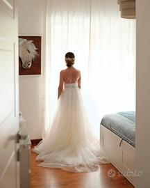 Vestito da sposa, scollo americana, corpetto lavorato leggero, aderente, leggermente trasparente basta comprare dei copri capezzoli che non si vede nulla. Portato in tintoria, post matrimonio, gonna in organza non tulle, tessuto molto più pregiato. molto comodo e leggero. Io mi sono trovata benissimo per tutto. Vendo compreso velo lungo pagato in Atelier 3500 €. sono una 42 e ho un seno seconda. La fascia in raso non è stata scelta in fase di prova perché era da aggiungere ed ho lasciato quella sottile col fiocchetto, ma è un’idea da prendere in considerazione per dare un tocco diverso prezzo trattabile