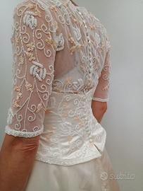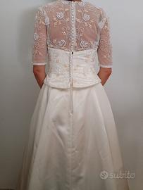 Vendo splendido abito da sposa in raso colore avorio, dallo stile elegante e romantico,indossato una sola volta e in condizioni impeccabili. Il corpetto è finemente ricamato con perline, che donano luce e raffinatezza senza risultare eccessive. Le maniche, lunghezza al gomito (3/4) son in delicato tulle trasparente,anch'esse impreziosite da ricami che richiamano quelli del bustino, per un effetto armonioso e sofisticato