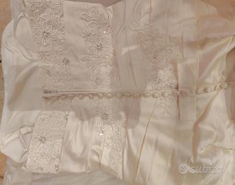 Vestito da sposa marca Eglantine Creations, taglia 40/42, 100% seta con perlina, pizzo macramè e tulle sotto la gonna. Chiusura con cerniera coperta di finti bottoni. Vestito pezzo unico. Vendo insieme al velo doppio con pettine. Prezzo di acquisto 1.950€. Vendo a 1.000€