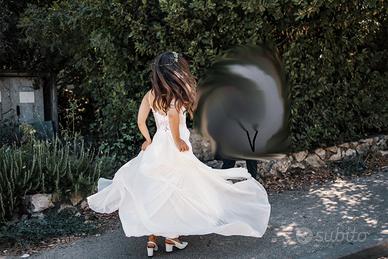 Come si vede nella quinta foto, lo strascico si può sollevare agganciandolo a un bottoncino dietro la schiena. Misure nell’ultima foto.