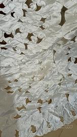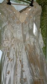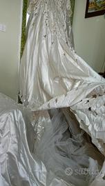 Bianco, con strascico, intagliato, con tante perle, sottogonna in seta, tulle e fiocchi. Adatto a donne con seno prosperoso.
