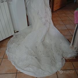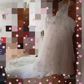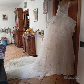 Vendo abito da sposa usato Scollo a cuore spalle scoperte. Chiusura allacciata con nastro sul retro e strascico. decorato strass r pajets taglia 42 /44 senza accessori in buone condizioni. prezzo ribassato.