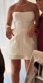 Vestito da sposa Pronovias, in tessuto mikado, taglia 42. Composto da vestito corto steccato con scollo a cuore e gonna con strascico da applicare sopra e da poter togliere durante la festa per un effetto sorpresa. Il vestito è stato acquistato a luglio 2025 presso atelier Marisa Spose, in perfette condizioni.