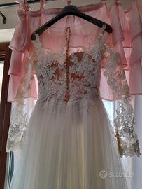 abito da sposa Pronovias con maniche e corpetto in pizzo e gonna in tulle.