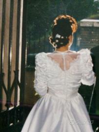 Abito da sposa a sirena bianco taglia 44 guarnito di perline con guanti strascico removibile usato una volta solo buonissimo stato.Anno 1992.
