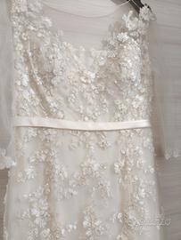 Vestito da sposa taglia M sirena con coda lunga fiori di pizzo 3d. Lavato in lavanderia usato una volta completo di velo .