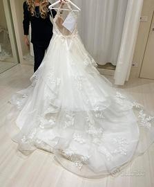 Vendo bellissimo vestito da sposa con scollo all’americana impreziosito da ricami e swarowski, dietro la schiena rimane scoperta ma è molto particolare. Gonna a balze rifinita perfettamente e ricamata a mano con fiori. Bellissimo lo strascico, consegno a mano e spedisco accuratamente