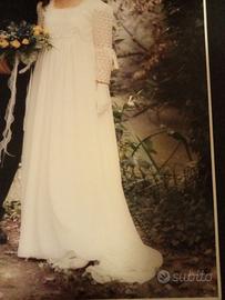 Immagine dal quale è tratto il modello stile Impero. Capo artigianale realizzato da una sarta. Abito in chiffon colore burro con corpetto in pizzo macramè nei toni in gradazione con il vestito. Taglia 42/44 del corpetto, il resto del vestito è morbido ed adattabile. Piccolo strascico come da foto.