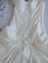 vendo vestito da sposa,con velo e sottogonna+nastro blu da legare dietro come un corpetto.Veste più taglie proprio perché si può stringere o meno il nastro.In 2 punti in basso è leggermente sporco.