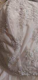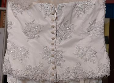 vendesi vestito da sposa taglia 44 (su altezza sposa 1,67) composto da gonna a sirena in raso leggero e corpetto in tulle e fiori di perline (come da particolare in foto); coprispalle in tulle. NON presenti macchie o difetti. Spedito nella sua sacca originale