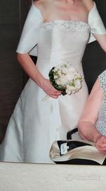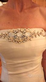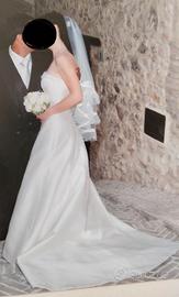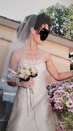 Abito da sposa Pronovias in mikado di seta colore avorio, taglia 40. Bustino steccato senza spalline impreziosito da fascia sul seno con applicazione di pietre e Swarovski, sul retro fila di bottoncini lungo tutta la schiena. L'abito e' completato da un velo medio con balza in tulle birellata, una stola ad anello in mikado e guantini in tulle. Abito acquistato presso la Boutique "Vanny sposa" a Terni al prezzo di 2850€, indossato solo per il giorno del matrimonio e successivamente lavato presso lavanderia specializzata e riposto ben chiuso nel suo sacco originale.