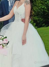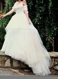 Abito da sposa con gonna in tulle, corpetto in pizzo con scollo a V e brillantini e spalline in Swarovski. Munito di velo lunghissimo, e copri spalle.