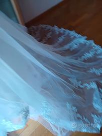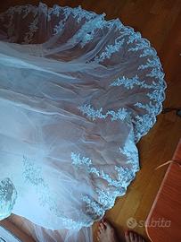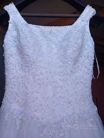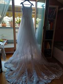 Vendo bellissimo abito da sposa, acquistato presso un atelier specializzato circa 6 anni fa. Taglia 44/46. Lavorato in pizzo e perline, con strascico di due metri circa (sempre in pizzo). Sottogonna rigida. Tenuto benissimo in armadio con il suo copriabito. Affare.