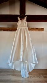 Elegante abito da sposa con dettagli in pizzo floreale e tulle trasparente sul corpetto. - Corpetto con scollo rotondo e maniche corte in pizzo. - Cintura in raso. - Gonna in tulle con applicazioni in pizzo.