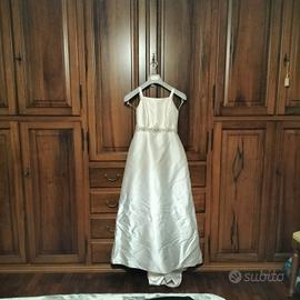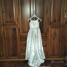 vestito da sposa in mikado pura seta con perline di strass ricamate in vita ...piccolo strascico in tulle da applicare,coprispalle in tulle pettinino con velo corpetto,calze ,giarrettiera taglia 40, in perfette condizioni lavato solo da stirare.