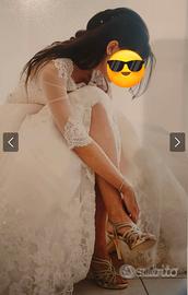 Vestito sposa ovviamente usato solo una volta,tinta tra il bianco e l'avorio,copri spalle rimovibile!taglia del vestito è una 38 leggermente modificata al peso di allora,ossia 48 kg per 1,67 di altezza!sul foglio della ricevuta ci sono scritte le misure esatte!Il vestito è stato pagato 1900 euro!purtroppo camminando nella città per foto anche se lavato due volte,nello strascico è rimasto un po' di nero,se qualcuno riesce a modificarlo o a pulirlo!