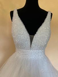 Romantico abito da sposa, taglia 34 per una sposa esile, alta circa 1,65 m. Questo abito da principessa di alta qualità è tempestato di innumerevoli strass. Anche la gonna ampia in tulle a sette strati brilla magnificamente da lontano grazie a questi.