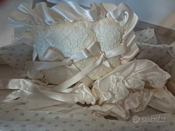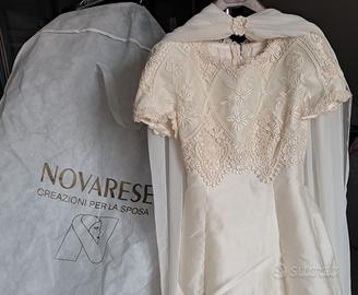 Abito da sposa di ottobre 1998 con strascico ,corpetto in pizzo ,piu' scialle in seta e guanti lunghi .