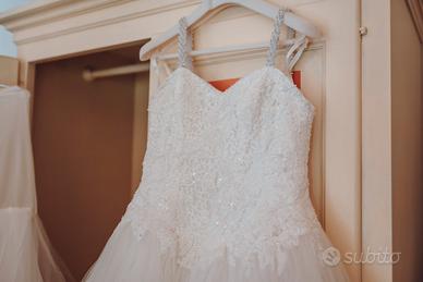 Vendo incantevole abito da sposa, indossato solo per poche ore e in condizioni impeccabili. L'abito è stato già pulito professionalmente ed è pronto per far brillare una nuova sposa.