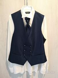 Vendo vestito da Sposo in perfette condizioni pari al nuovo, colore Blu, completo di Giacca, Pantalone, Gilet, Camicia, Cravattino, Scarpe, Cinta, Brillante per Cravattino, Porta Abito.