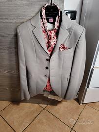 Colore grigio ghiaccio, completo di giacca, pantalone , bretelle, gilet,foulard, e poushet. Pari al nuovo usato solo una volta e poi portato in lavanderia . completo di sacca pagato2000€