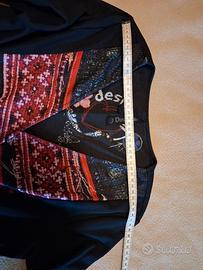 vestito DESIGUAL nero con patchwork frontale con motivi etnici multicolore, taglia 42, drappeggio su un fianco.