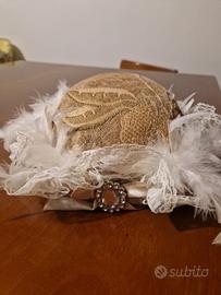 Materiali e Colori:Il tessuto principale è in broccato o un materiale simile, nei toni del beige, oro o marrone chiaro, con un motivo paisley o floreale. Presenta ampie bordature di pizzo bianco o crema e nastri abbinati.