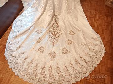 Vestito molto bello in raso con una bellissima decorazione sul corpetto e sullo strascico lungo 3 metri e tutto lavorato sulla coda maniche a sbuffo con fiocchi grandi sulle maniche vestibilità piccola taglia S per una corporatura piccola vendo a 500 eur.o trattabili.