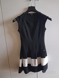 vestito bianco e nero che scende a barchetta sopra il ginocchio per altezze 1.60,la lunghezza e' sopra il ginocchio.95%poliestere e 5% elastano.La parte posteriore del vestito ha il pizzo nero trasparente.