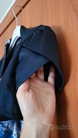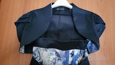 Vestito da cerimonia marca JE SUIS! Taglia 40 aderente di raso di cotone blu e variopinto, effetto arricciato sui fianchi. Coordinato con un bolerino coprispalle.