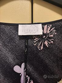 Elegante abito lungo originale Iceberg in 100% seta, con stampa floreale e farfalle multicolor su fondo nero.