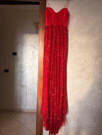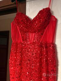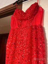 Abito a sirena, taglia s, leggermente elasticizzato, con bustino a stecche velato, e corsetto a cuore non imbottito. Presenta anche dei manicotti dello stesso tessuto del vestito, brillantinati, che possono essere indossati facoltativamente poiché non sono collegati al vestito. É stato usato solo per la festa dei miei 18 anni , non si è assolutamente rovinato, nemmeno sul leggero strascico. (PREZZO TRATTABILE)