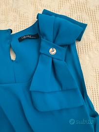 Elegante vestito da donna Fly Girl, perfetto per ogni occasione. La parte superiore è di un vivace color blu, mentre la gonna è in un classico nero. - Design senza maniche. - Dettaglio fiocco sulla spalla. - Scollo a U con apertura.