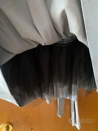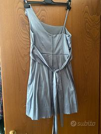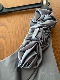 In satin grigio perla morbidissimo, con tulle interno per dare volume e rose sulla spalla. Taglia S , indossato solo una volta