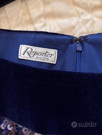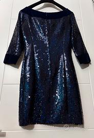 Tubino di paiette blu al ginocchio, lunga cerniera posteriore,foderato, con maniche tre quarti, polsini e collo in velluto blu scuro
