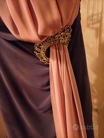 Elegante abito da cerimonia taglia 42 in poliestere colore grigio con inserto di brillantini a forma di fiore. Fascia rosa antico che passa all'interno del fiore per scendere a cascata fino all'orlo. Sciarpa sempre rosa antico lunghezza leggermente sopra al ginocchio. Usato 1 sola volta, perfetto. Pagato 350,00 euro