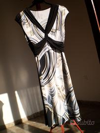 DESCRIZIONE: vestito da donna indossabile benissimo quotidianamente per lavoro e tempo libero prodotto in Italia 95% poliestere - 5% elastan tessuto molto morbido ed elasticizzato; corto (alle ginocchia) e senza maniche, scollatura a V profondo e cintura inclusa; nuovo mai indossato (pulitissimo); fantasia della stoffa a più colori con diverse tonalità e sfumature; vedere le foto